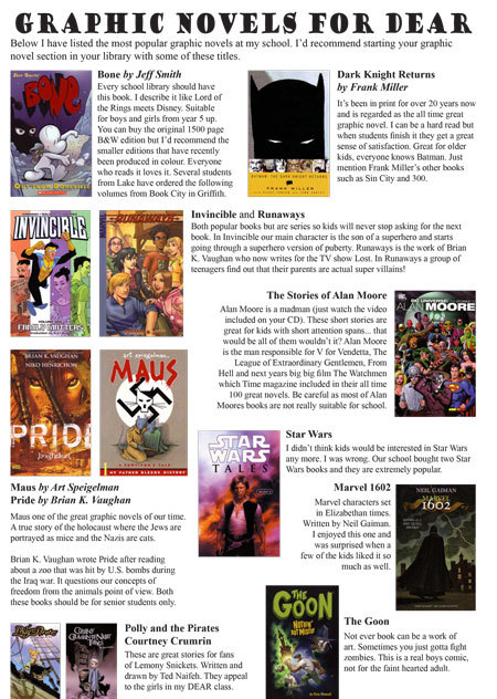 I got a few emails over the week asking for more info about Graphic Novels for boys. I have this handout (linked below) I made to use at a presentation way back in 2007. A lot has changed since then in the way media is consumed. I read more comics now than I did but I read them via my iPod, tablet or phone which has made them more affordable, more accessible and for the young person new to graphics novels, easier to comprehend via the new technologies of guided viewing.